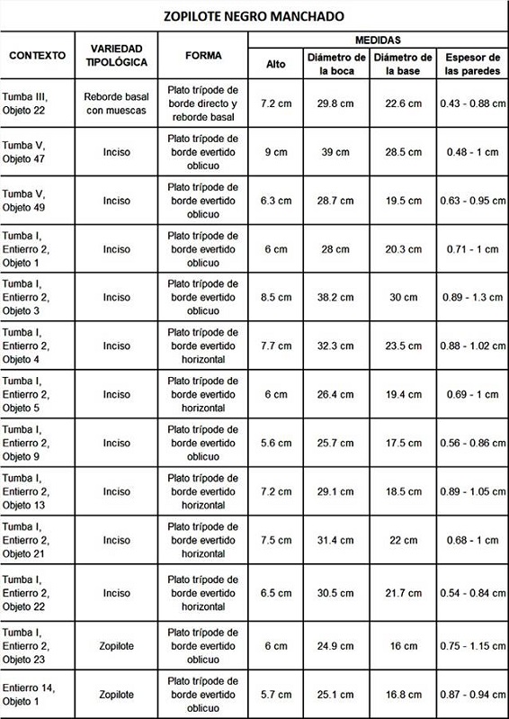 Los datos recabados del material de la Tumba I indican que entre esta muestra existen dos variedades: Inciso y Zopilote, donde 8 son de la primera y 1 de la segunda. Desde una perspectiva formal, cuatro platos trípodes tienen borde evertido oblicuo, mientras que el resto lo tienen evertido horizontal.