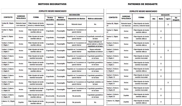 Se debe apuntar que entre las vasijas de la colección de Yaxchilán se distinguió entre las afectaciones de carácter tafonómico y las huellas de desgaste por uso. Las primeras refieren a alteraciones erosivas en determinadas áreas de las vasijas (aunque estas no se encontraron entre los contenedores considerados para el presente estudio); mientras que las segundas se presentan con un patrón muy específico de acuerdo a la clase de vasija en cuestión. En la muestra, el desgaste se focaliza en bordes de bocas y bases de los cuencos del tipo Baadz policromo crema, en tanto que en los platos trípodes del tipo Zopilote negro manchado se encuentra en el centro de los fondos y en los soportes.