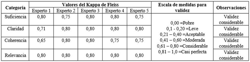 Por un lado, cinco peritos, docentes especialistas en el tema de estudio y en metodología de la investigación comprobaron la validez del instrumento, para medir si las variables se vincularon con la cantidad de dimensiones en esta pesquisa, conforme a la validez de contenido (Hernández y Mendoza 2018; Salvatierra 2020), mediante el coeficiente Kappa de Fleiss que mide la concordia entre expertos (Bernal et al. 2020; Escobar y Cuervo 2008) como expresa la Tabla 1.