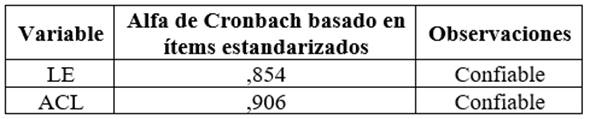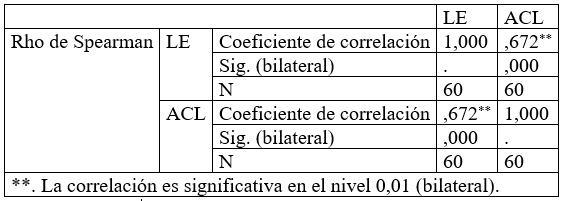 La Tabla 5 ofrece los hallazgos del test de correlación Rho de Spearman donde se obtuvo una asociación positiva de magnitud moderada r= 0.672, y un p-valor 0.000 que condujo al rechazo de la hipótesis nula al evidenciar ser inferior al grado de significación determinado (p<0.05), aceptando así la HG a un nivel de confianza de 95 %, concluyendo que él LE se relacionó significativamente con el ACL en la IEP MA de Juliaca, Puno, durante 2021.
