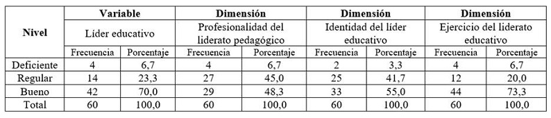 Finalmente, a partir de la percepción del líder educativo obtenida por los encuestados se llegó a la interpretación de que en los ítems que describían a la dimensión profesionalidad del liderato pedagógico se encontraron 4 docentes en el rango deficiente, 27 profesores en el nivel regular y 29 maestros en el rango bueno. Mientas que en la dimensión identidad del líder educativo se ubicaron en el nivel deficiente 2 profesores, 25 en el rango regular y 33 en el nivel bueno. Además, en la dimensión ejercicio del liderato educativo se hallaron 4 profesores en el nivel deficiente, 12 en el rango regular y 44 en el nivel bueno. Dichos datos reflejaron la coherencia entre las percepciones de los docentes y las dimensiones medidas.