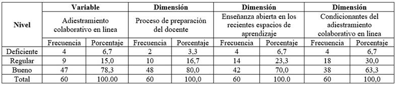Se mostró que el 80 % de docentes consideró como bueno a la dimensión proceso de preparación del docente en la institución educativa, por su parte, el 16,7 % catalogó como regular dicho proceso en la entidad, y tan solo el 3,3 % percibió que el desarrollo de la formación del maestro para la enseñanza virtual en la institución fue deficiente.