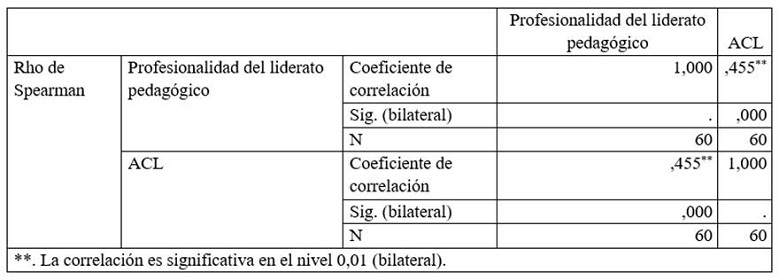 Además, conforme al primer objetivo específico planteado en la investigación, al definir la relación entre la profesionalidad del liderato pedagógico y el ACL, se determinó la asociación significativa y positiva de nivel moderado en las variables descritas, expuesta por un coeficiente r= 0.455 y un grado de significación p-valor= 0.000, que admitió desestimar la hipótesis nula (p<0.05) y acoger la primera hipótesis específica, por lo que se deduce que a mayor nivel de profesionalidad del liderazgo en la IEP mayor será el desarrollo del ACL.