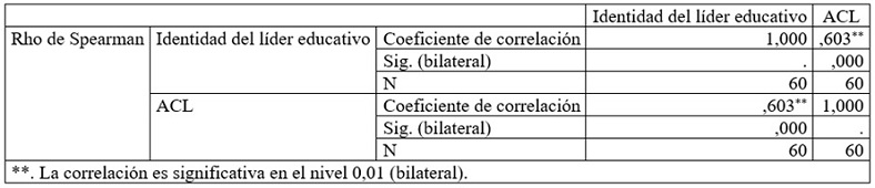 También, sobre la base de los resultados del segundo objetivo específico, al determinar la relación entre la identidad del líder educativo y el ACL, se logró establecer la asociación significativa y positiva de nivel moderado en dichas variables, expuesta por un coeficiente r= 0.603 y un nivel de significancia p-valor= 0.000 que permitió desestimar la hipótesis nula (p<0.05) y admitir la segunda hipótesis específica. Se infiere que, a mayor identidad del liderato, mayor el desarrollo del ACL.