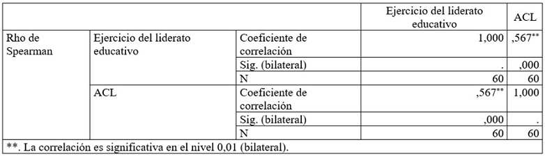 Adicionalmente, de acuerdo al tercer objetivo específico, al comprobar la relación entre el ejercicio del liderato educativo y el ACL en la IEP MA de Juliaca, Puno; se determinó la asociación significativa y positiva de nivel moderado en las variables de este estudio, expuesta por un coeficiente r= 0.567 y una gradualidad de significación p-valor= 0.000 que admitió desechar la hipótesis nula (p<0.05) y reconocer a la tercera hipótesis específica. Se concluye que, a mayor ejercicio del liderato educativo, mayor desarrollo del ACL.
