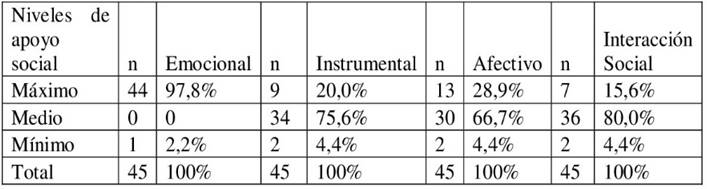 En este grupo de pacientes en tratamiento de hemodiálisis, el valor correspondiente al nivel máximo de apoyo emocional agrupó a 44 de los 45, fue esta la dimensión considerada más importante por su relación con el cariño y empatía de que dispuso el paciente en su entorno para adaptarse a su enfermedad (Alonso, Menéndez y González 2013).
