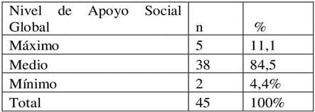 En cuanto al apoyo social global, encontrado en nivel medio en la mayoría de la muestra del estudio, este dato coincide con el reportado por una investigación con pacientes en tratamiento de hemodiálisis efectuada por Carrillo et al. (2018).