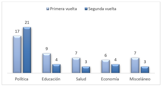 La Figura 2 recopila las cinco categorías mencionadas con mayor frecuencia en su discurso, se demuestra que en las dos campañas (primera y segunda vueltas) el tópico principal corresponde a política.