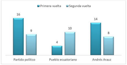 Se identificó que en la primera vuelta Arauz mencionó como eje principal a su partido político desde la primera persona gramatical, dejando en segundo plano la presencia del pueblo ecuatoriano.