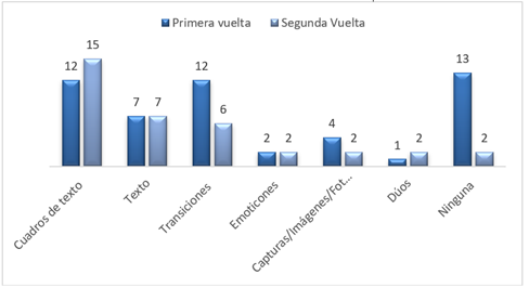 La Figura 5 expone la cantidad de elementos visuales utilizados durante la campaña tanto en la primera como en la segunda vuelta; los de mayor uso fueron: cuadros de texto, transiciones y textos. Sin embargo, para el caso uno (campaña para la primera vuelta electoral) gran parte de los contenidos no contaron con elementos extras en el video.