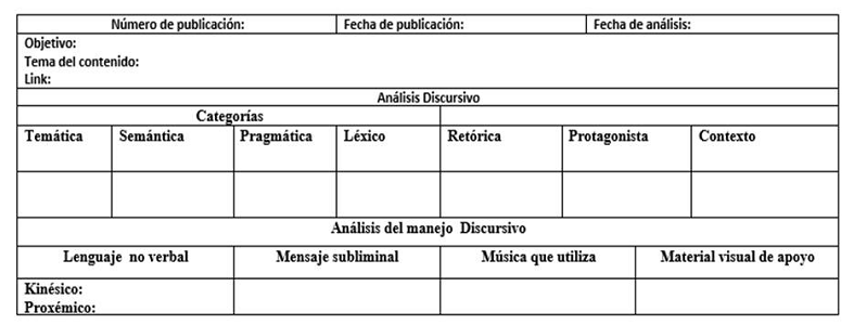 Se diseñó una matriz de análisis de contenido y se tomaron como criterios relevantes para el análisis del discurso a varias áreas: la pragmática, la retórica, la semántica, el léxico, el protagonista, además del lenguaje no verbal (kinésico y proxémico) y el material visual de apoyo.