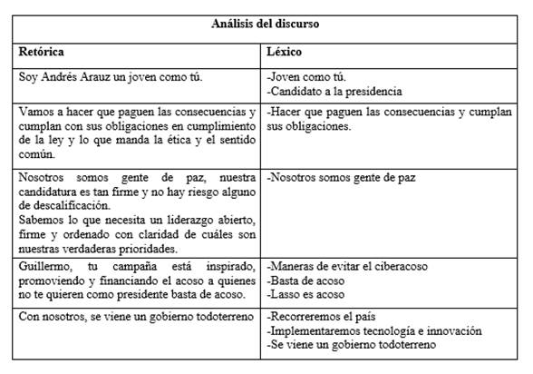Tomando como paradigma la perspectiva de Van Dijk (1999) en torno a la estructura de los discursos, se utilizaron los parámetros: léxico y retórica para interpretar el discurso manejado en la campaña de Arauz en TikTok, reflejado en la Tabla 2.