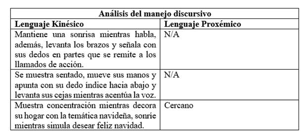 Al ser TikTok una red social bastante visual, se consideró realizar el análisis tomando en cuenta la comunicación no verbal, por ende, se establecieron los lenguajes kinésico y proxémico como factores a examinar. Se encontró que el candidato Andrés Arauz en la mayoría de contenidos se muestra con una sonrisa, levanta sus cejas al hablar y mueve sus manos, transmitiendo a la audiencia un ambiente amigable cuando se refería a él, al partido político, a sus propuestas o a su familia.
