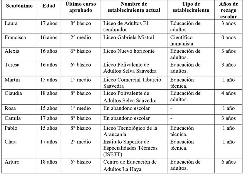 Como consecuencia de lo anterior, tenemos que un aspecto particular en la percepción negativa y estigmatizada que los adolescentes construyen sobre sí mismos se relaciona con las lógicas temporales impuestas en escuelas y liceos. En este sentido, este estudio reveló que un joven que para el sistema escolar y sus agentes está atrasado, es decir, ha repetido uno o varios cursos o se reintegra luego de un periodo de abandono, a menudo experimenta el tiempo social definido por la escuela -y reproducido en algunos casos por sus madres, padres y profesionales de programas del SENAME- como un fracaso y un estigma. Esto lleva a algunos estudiantes a sentir que no encajan, que no pertenecen a ningún lugar en el sistema tradicional de educación que, además, los excluye recordándoles su condición irregular constantemente.