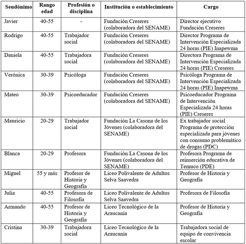 La segunda fase consistió en invitar, entrevistar y observar los contextos cotidianos (centros del SENAME, escuelas y barrios) de los jóvenes que aceptaron participar de la investigación. De una lista inicial de aproximadamente 30 jóvenes, 11 de ellos participaron de la investigación (7 mujeres y 4 hombres), realizándose 18 entrevistas. Asimismo, se entrevistó a 7 profesionales representantes de los dos centros del SENAME y a 4 profesionales de la educación de establecimientos escolares, realizándose 11 entrevistas. Para ambos casos, la construcción de la muestra se realizó a partir de un muestreo no probabilístico de tipo bola de nieve (Corbetta 2007) y del criterio de saturación de la información (Martínez-Salgado 2012).