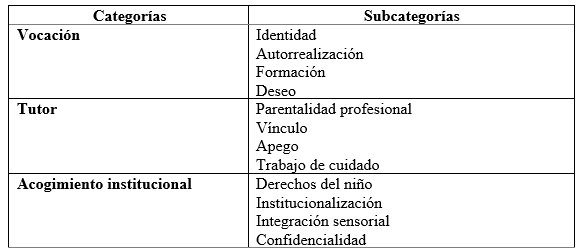 Posterior al estudio de estas unidades de análisis, se procedió al diseño de la entrevista semiestructurada, que según Hernández, Fernández y Baptista (2014) se basa en una guía. Sin embargo, el entrevistador puede añadir preguntas adicionales que surjan en el momento con el fin de precisar y obtener mayor información. En cuanto a la elaboración de las preguntas, las autoras construyeron un cuadro de categorías y subcategorías, en el que las variables: vocación, tutor y acogimiento institucional fueron las principales, de las cuales se desprendieron varias subcategorías como: identidad, autorrealización, formación, deseo, parentalidad profesional, vínculo, apego, infancia tutelada, trabajo de cuidado, derechos, institucionalización, integración sensorial y confidencialidad.