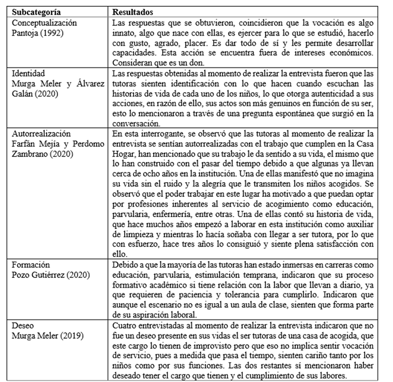 El tutor de una casa de acogida de niños debe mostrar vocación. Las tutoras investigadas facilitaron la descripción de sus labores a diario, experiencias de vida, aspiraciones y satisfacción con las actividades realizadas, así como la observación de las mismas. Por lo tanto, la valoración de la categoría vocación fue analizada en su totalidad.