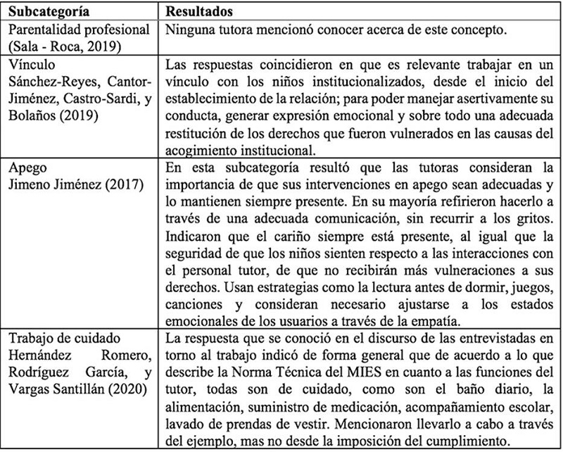 En esta categoría resaltó la novedad de que las tutoras participantes refirieron no conocer acerca de la parentalidad profesional, término introducido en el estudio de Sala (2019), lo que puede ser considerado como un tema de capacitación dentro de la propuesta de profesionalización que refieren Farinango-Lema y Pardo (2021) quienes en su supuesto para un perfil del tutor mencionan que las acciones de los cuidadores formales en el acogimiento institucional deben tener un carácter profesional para mejorar la calidad del servicio de acogimiento.