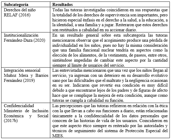 Concerniente a la categoría de acogimiento institucional, según se muestra en la Tabla 4, se encontraron resultados importantes referentes al conocimiento que los tutores tienen sobre los derechos de supervivencia de los cuales los niños son sujetos, hecho que otorga un tinte humanista a su labor. Resulta significativo, además, que las tutoras tengan una adecuada percepción sobre el desarrollo evolutivo sano de los infantes acogidos y la pérdida de individualidad que la institucionalización produce en esta población.