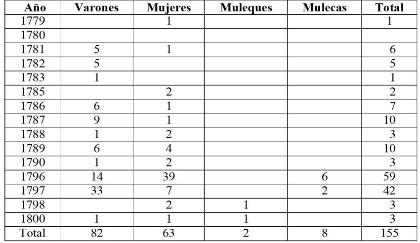 Entre 1779 y 1800 registramos un total de 155 esclavos procedentes de Guayaquil, como se especifica en la Tabla 2. De ellos, 82 varones (52.9 %), 63 mujeres (40.6 %) y 10 esclavos menores de edad (6.5 %). Cabe aclarar que esta cantidad es una aproximación en tanto que, además, se dio la introducción de esclavos por comercio ilícito.
