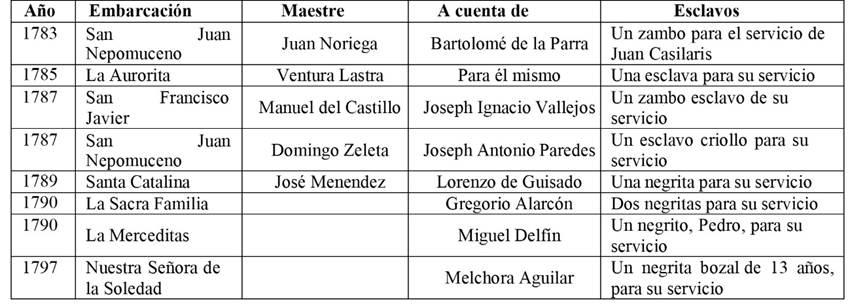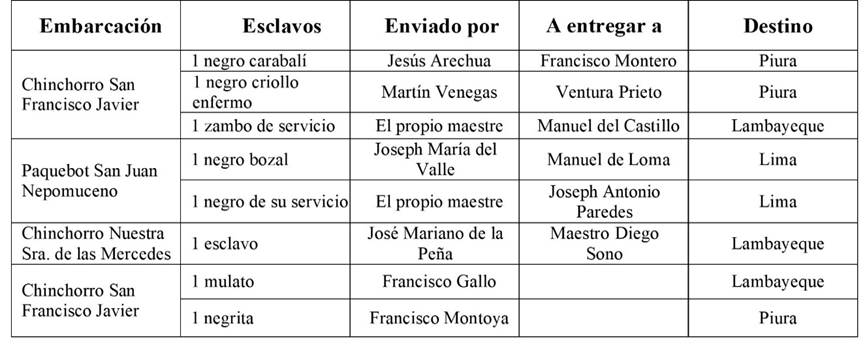 La mayor parte de importaciones fueron realizadas por los mismos maestres de embarcaciones que conducían esclavos al menudeo para ser entregados a consignación de algunos particulares, dueños de haciendas ubicadas a lo largo de la costa peruana. En la Tabla 3 se ejemplifica el modo en que ocurría el ingreso de esclavos al menudeo, en diversas embarcaciones.