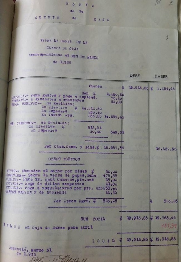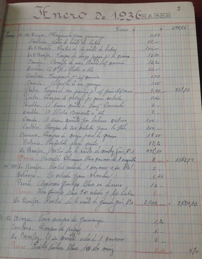 In the second group, the percentage of the population that was made up of salaried workers and farmers, we have little information, which comes from primary sources from the center of the country. According to salary data paid in 1936 to baker's assistants, they received between 2-5 sucres daily (Figure 1), which could represent a sum of between 40 and 100 sucres per month, which could include between 4 and 10 sucres more if weekends are taken into account. The work in the large cattle ranches was better paid, with a salary of around 75 sucres per month in 1936. In addition, as the account book shows (Figure 2), the workers also received extra payments in goods, be they in cattle, beef, sheep, potatoes, corn, etc.