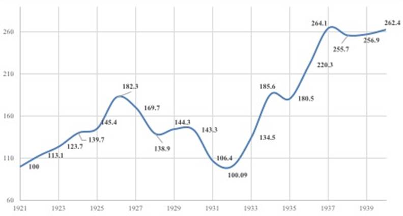 Based on the data, it can be seen that wages fluctuated in direct relation to the price index. That is, until 1932, taking into account the deflationary phenomenon, real wages increased because nominally they remained stable since 1929. After 1932, when policies related to the gold standard are set aside, inflation has a direct impact on wages: real wages decreased while employment increased due to the growth of the money supply, confirming the Phillips curve (Naranjo 2021). As can be seen in Figure 3, the growth of inflation stops in 1937, with which it can also be said that wages begin to stabilize from the same year.