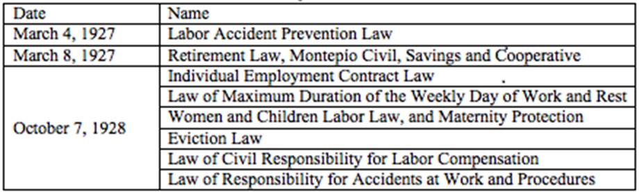 Law of Responsibility for Work Accidents and Procedures: the legal body was published in 1928, it is made up of two parts: first, the responsibilities of the worker in accidents and work-related illnesses; second, the responsibilities of employers in relation to the partial disability of their employees due to labor problems,