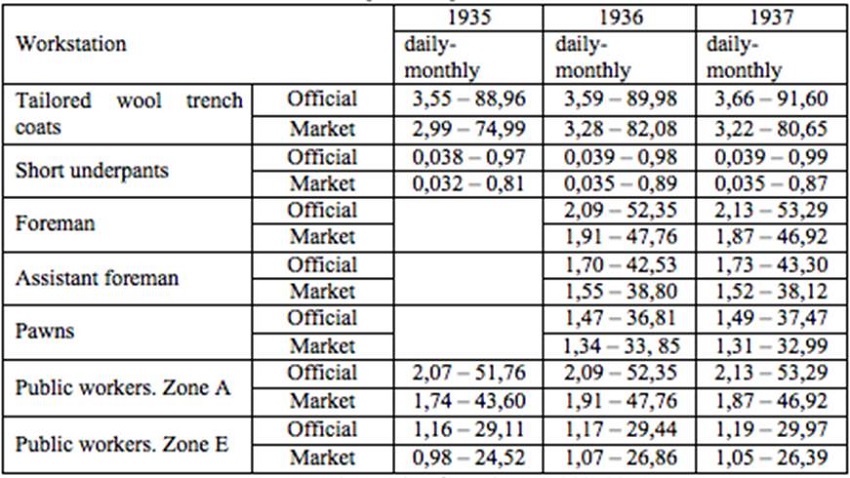 Within the textile industry, wages are also differentiated between those who work in wool raincoats and those who work in shorts. The former with a minimum of 11 pesos, and the latter with a minimum of 12 pesos. The masons' strike of 1936 (Owen 1938) caused the authorities to publish the resolution of March 24, which formalized the minimum wage for foremen (6.40 pesos), foreman assistants (5.2 pesos), and pawns (4.5 pesos).