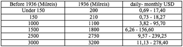 On January 13, 1936, a decree was published by means of which there was a special treatment for the salary of federal civil personnel, which was included in the law published on January 13, 1936. Those workers with a salary of less than 150 milreis, increased to 200 milreis; workers with an income between 150 and 1,500 milreis, their salaries increased by 40% up to 500 milreis, 20% per penny up to 1,000 milreis, and 10% per penny up to 1,500 milreis. For that group of workers with an income between 1,500 and 2,500 milreis, the increase was 300 milreis. Workers with an income between 2,500 and 3,000 received an increase of 250 milreis. And, workers with income between 3,000 and 4,000 received an increase of 200 milreis.