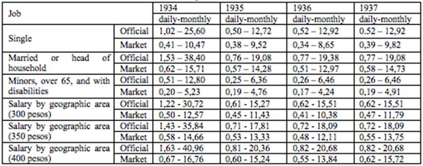 The Superior Labor Council began to discuss a proposal for a bill on the minimum wage, which was approved in March 1935 to be presented to the national congress. The bill contemplated a minimum daily income that should not be less than two-thirds nor more than three-fourths of the normal or currently paid salary in each area of the country.
