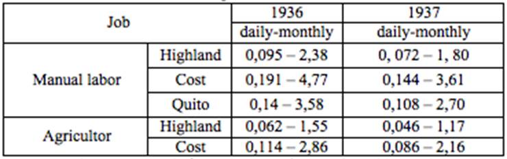 In the case of the manual worker, the minimum wage was 2 sucres per day on the Coast and 1 sucre per day in the Sierra. The capital, Quito, received differentiated treatment, the worker received a salary of 1.5 sucres. In the case of the agricultural worker, the minimum payment was also differentiated.