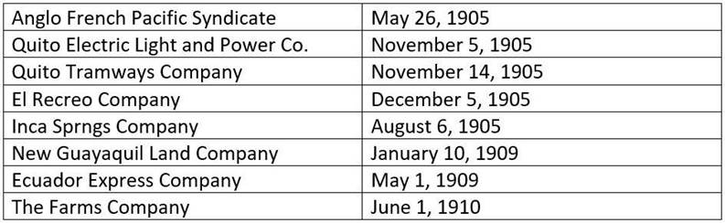 The Guayaquil and Quito Railway company was incorporated in New Jersey precisely because of the holding company law and the minimal capitalization requirements for incorporation. From the beginning the Guayaquil and Quito Railway company was interested in much more than just building a railroad, as will be shown in the development of the railroad’s subsidiary companies.