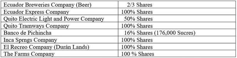In 1946 the Ecuadorian Corporation liquidated the Quito Tramways company as it was no longer able to compete with bus and automobile transportation in Quito. This was followed the same year with the sale of its Quito Electric Light and Power Company to the Quito municipal power company for S/.8,000,000 (El Comercio, October 19, 1946). In 1956 the Corporation sold its 34½ % interest in the International Products Corporation for $1,100,000 to Pamela J. Woolworth of the Woolworth Department store fortune (Miami Herald, February 8, 1956).
