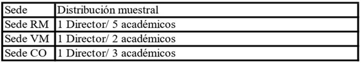 La investigación fue realizada entre diciembre de 2020 y julio de 2021, correspondió a ocho meses de trabajo de campo de acuerdo a lo planificado para esta instancia. La muestra del estudio es no probabilística, intencional y discrecional y corresponde a tres Directoras de la Carrera de Educación Infantil y diez académicos que imparten clases en el mismo programa, en cada una de las sedes, correspondientes a la Región Metropolitana, Región Valparaíso y la Región del Biobío.