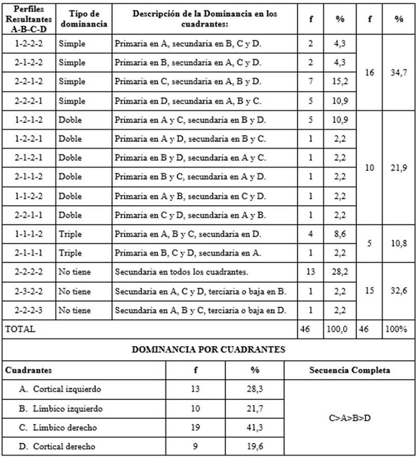 En relación con la dominancia por cuadrantes se tienen los siguientes porcentajes: el 41,3 % en el cuadrante C. (LD), el 28,2 % en el cuadrante A. (CI), el 21,7 % en el cuadrante B. (LI), y el 19,6 % en el cuadrante D. (CD). La secuencia completa en orden decreciente es C>A>B>D, se puede observar la mayor preferencia por el cuadrante C (Límbico Derecho con un 41,3 %).