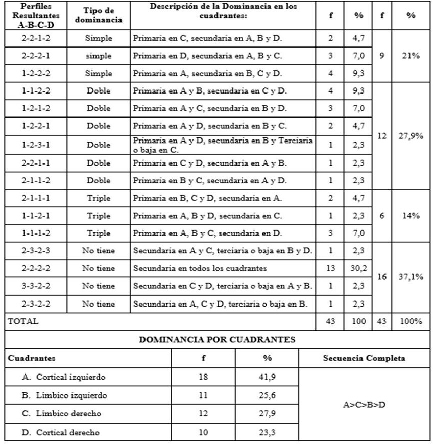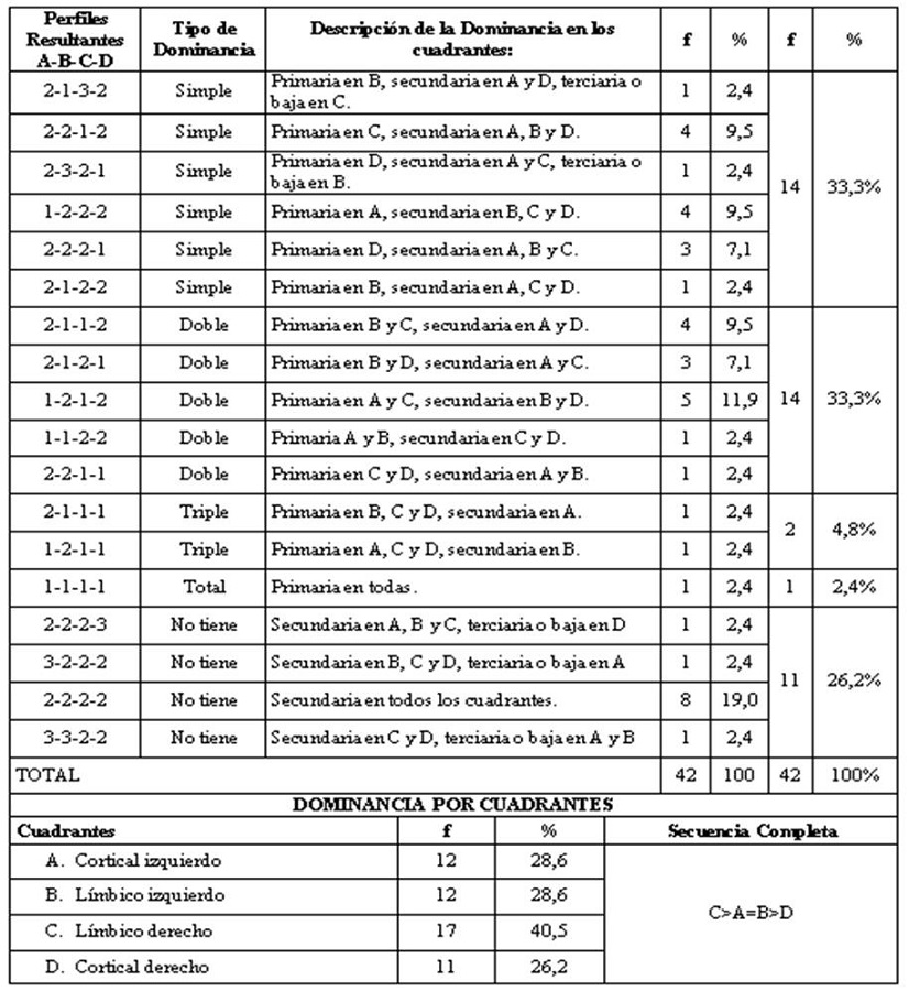 En referencia a la dominancia por cuadrantes se presentan los siguientes porcentajes: el 40,5 % en el cuadrante C. (LD); el 28,6 % en el cuadrante A. (CI); el 28,6 % en el cuadrante B. (LI); y el 26,2 % en el cuadrante D. (CD). La secuencia completa en orden decreciente es C>A=B>D. Se puede observar la mayor preferencia por el cuadrante C. Límbico derecho (40,5 %).