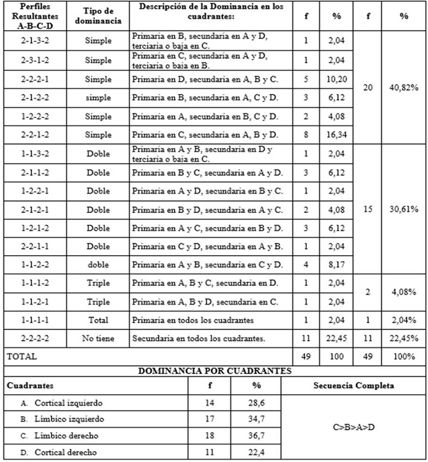 Referente a la dominancia por cuadrantes se presentan los siguientes porcentajes: el 36,7 % en el cuadrante C. (LD); el 28,6 % en el cuadrante A. (CI); el 34,7 % en el cuadrante B. (LI) y el 22,4 % en el cuadrante D. (CD). La secuencia completa en orden decreciente es C>B>A>D. Se puede observar la mayor preferencia por el cuadrante C. Límbico derecho (36,7 %).