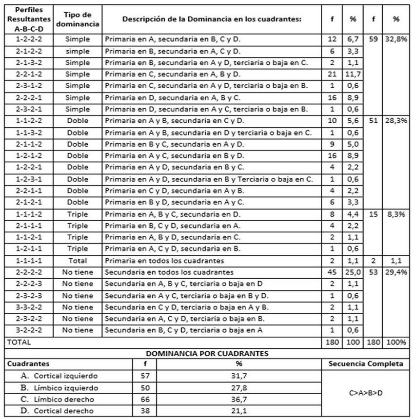 En relación con el tipo de dominancia es oportuno señalar lo expresado por Yarlequé et al. (2018), al indicar que en varios estudios con muestras grandes aproximadamente un 25,1 % presenta dominancia simple; un 16,5 % dominancia doble; un 10,2 % dominancia triple y un 5,2 % de la muestra tiene un cerebro en los que los cuatro cuadrantes son dominantes.