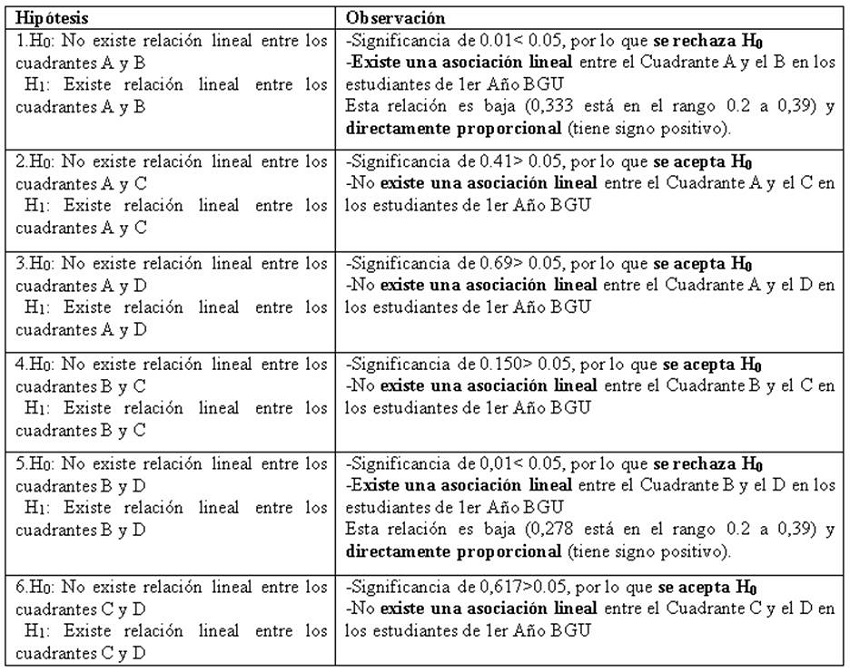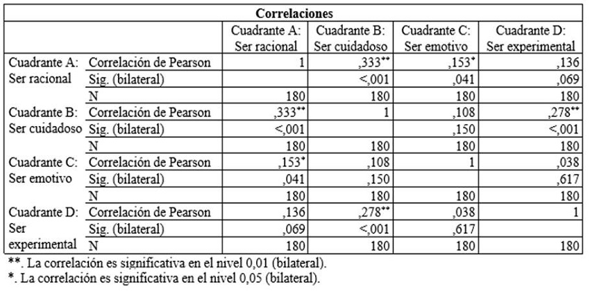 A propósito de la relación o correspondencia entre los cuadrantes, se puede aseverar que el Cuadrante B. (LI) presenta correspondencia con los Cuadrantes A. (CI) y D. (CD). Esta correspondencia es directamente proporcional, es decir, a mayor valor del (Cuadrante B-Ser cuidadoso) mayor valor del (Cuadrante A-Ser racional) y a mayor valor de (Cuadrante B-Ser cuidadoso-) mayor valor de (Cuadrante D: Ser experimental).