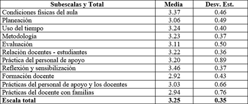 El puntaje más bajo se encontró en la subescala Formación docente, la cual valora los procesos formativos del profesorado, e indica que es mucho lo que se puede y debe lograr en este aspecto de la práctica. Otra subescala también con puntaje bajo es la concerniente a Práctica del personal de educación regular y familias, puntaje que indica que también se debe mejorar la comunicación y el trabajo conjunto de la planta docente con las familias.