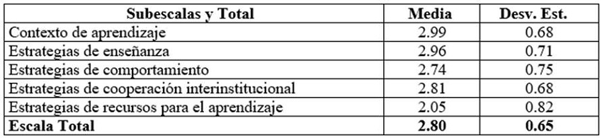 También, relativamente alta se muestra la subescala Estrategias de enseñanza, referida a los esfuerzos del profesorado por apoyar los aprendizajes de sus alumnos mediante la enseñanza de habilidades específicas (solución de problemas, memoria) y a definir sus propias metas. Por otro lado, la subescala con el puntaje más bajo es la de Estrategias de recursos para el aprendizaje, relacionada con los apoyos que reciben las escuelas y los docentes para atender al alumnado con NEE.