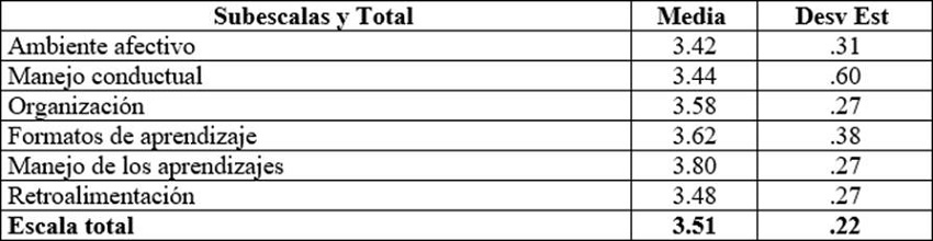 Los resultados correspondientes a la Escala CODCA resultan particularmente interesantes, pues los instrumentos anteriores son autoaplicados, esto es, representan la opinión y la percepción de los docentes, mientras que en este una persona observadora independiente valora los distintos reactivos.