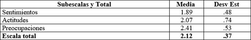 La SACIE, como ya se indicó, incluye dos subescalas (Sentimientos y Preocupaciones); sus puntajes se interpretan de manera invertida. El puntaje de la subescala Sentimientos indica que la planta docente considera la discapacidad como una condición poco amenazante e inquietante. Sin embargo, el puntaje de la subescala de Actitudes refleja que la planta docente tiene una disposición poco favorable para la inclusión de estudiantes con discapacidad en sus aulas. El puntaje de Preocupaciones indica que los docentes están preocupados por no poder ofrecer toda la atención que requiere la presencia del alumnado con discapacidad por exceso de trabajo o falta de conocimientos.