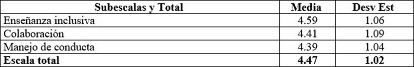 Se califica en una escala tipo Likert de seis puntos (de 1= en total desacuerdo a 6 = en total acuerdo). Su confiabilidad en México es alta (α = 0.941) (Forlin et al., 2010).