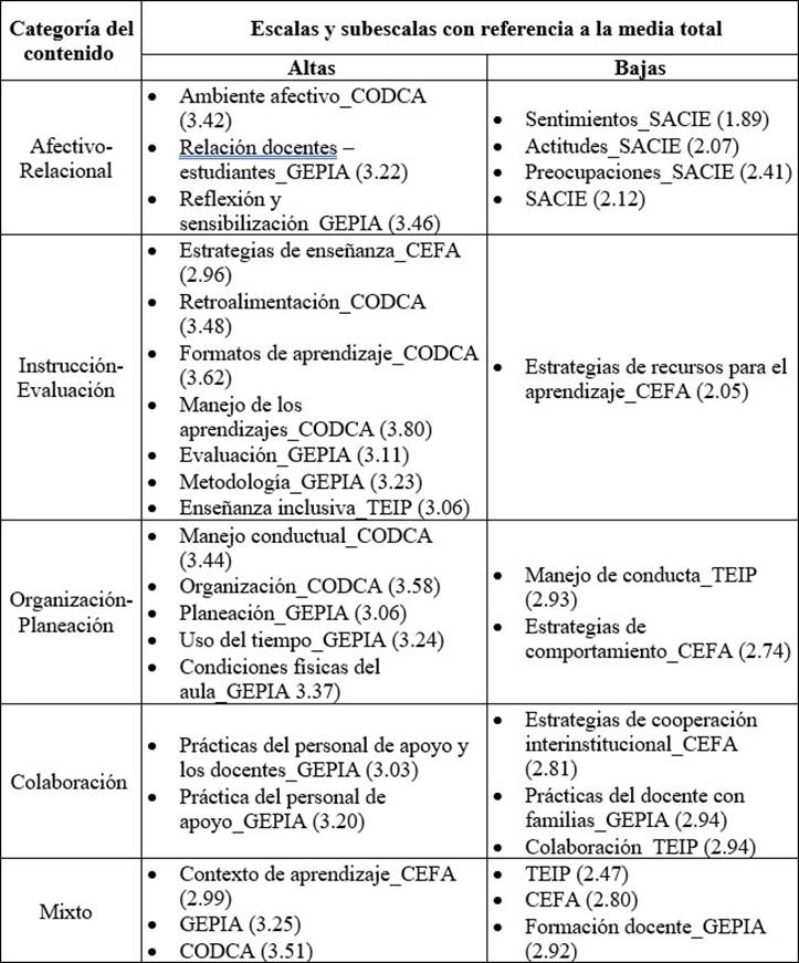 Para apreciar mejor la calidad de las prácticas inclusivas observadas y reportadas, cada subescala se clasificó en una de las siguientes categorías, según su contenido: Afectivo relacional (actitudes, sentimientos y relaciones interpersonales), Organización-planeación (organización durante la clase y planeación de esta), Instrucción-Evaluación (estrategias de enseñanza y de evaluación), Colaboración (trabajo colaborativo con profesionales y familias) y Mixto que incluye las escalas y subescalas que abarcan dos o más categorías. Posteriormente, se obtuvo la media total (Mtotal=2.96, D. E= .057); los puntajes de las escalas se clasificaron en altos y bajos, considerando la media total como punto de corte. Esta clasificación se presenta en la Tabla 6.