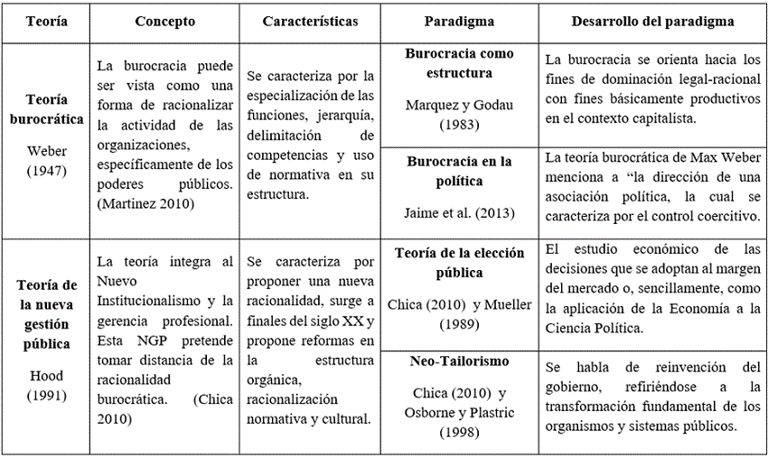 La burocracia, como base primigenia para la estructuración del Estado, sustenta las políticas públicas. Este enfoque le otorga características propias de jerarquización y especialización visualizadas en instituciones públicas como las propias universidades. La teoría de la nueva gestión pública contempla factores de cambio institucional producto de la globalización y la competitividad; cambios reflejados en la calidad y mejora de procesos.