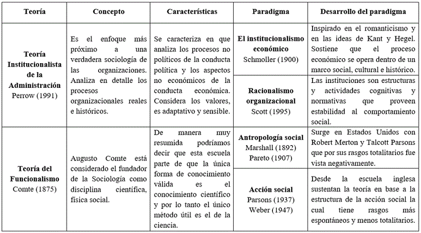 El primer enfoque toma como base a la teoría del funcionalismo, con Auguste Comte como fundador. Tuvo dos etapas, una que nace desde la antropología social en Estados Unidos con Robert Merton y Talcott Parsons y que posteriormente por sus rasgos totalitarios fue vista negativamente; la segunda inicia con Alfred Marshall, Vilfredo Pareto y Max Weber que desde la escuela inglesa sustentan la teoría con base en la obra: La estructura de la acción social, con rasgos más espontáneos y menos totalitarios.