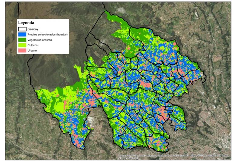 Para el levantamiento de información se empleó la encuesta y como instrumento el cuestionario. Ante la carencia de información del universo poblacional, se aplicó la técnica de teledetección que permitió identificar, por vía satelital, el universo de los huertos existentes en la parroquia Sinincay, según se muestra en la Figura 1.