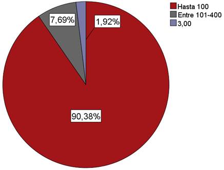La Figura 3 muestra que 58 mujeres (90,38%) invierten hasta $100 mensuales en sus cultivos, mientras que 5 (7,69 %) invierte entre $101 y $400, y tan solo el 1,92%, es decir, 1 persona gasta sobre los 401 dólares en producir sus productos.